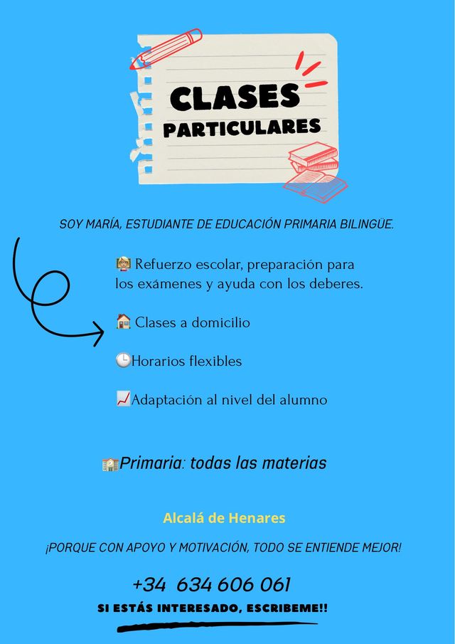 Detalles del productoMi nombre es Maria, estudiante de magisterio y con experiencia como profesora particular y como monitora de niños. Ofrezco clases particulares a niños de primaria de cualquier asignatura como matemáticas, lengua, naturales, sociales o ingles.