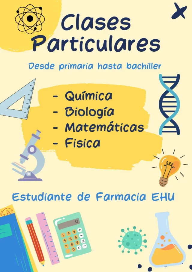 Detalles del productoSoy una estudiante de 1⁰ de Farmacia en la UPV/EHU. Ofrezco clases de apoyo de química, biología, matemáticas y física. Desde primaria hasta bachillerato. Para cualquier cosa no dudes en contactarme.
