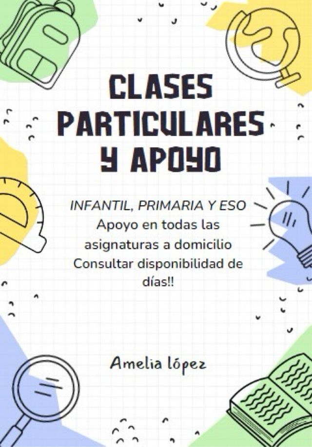 Detalles del producto¡Hola! Soy Amelia, estudiante del doble grado de educacion Primaria e Infantil. Ofrezco clases particulares o de apoyo escolar para niños y niñas que necesiten refuerzo en algunas asignaturas si nos referimos a alumnos de primaria, o en lectoescritura si hablamos de alumnos de infantil entres otras.