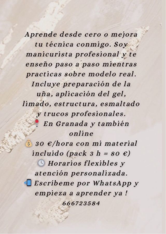 Detalles del productoAprende desde cero o mejora tu técnica conmigo. Soy manicurista profesional y te enseño paso a paso mientras practicas sobre modelo real.