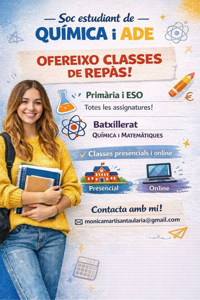Detalles del productoSoc estudiant de Química i ADE i ofereixo classes de repàs.