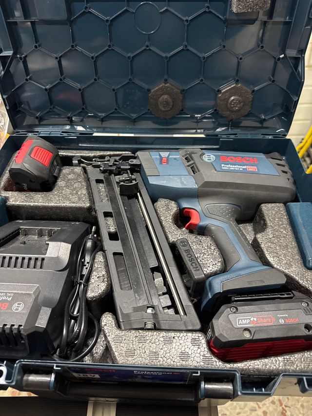 Clavadora profesional Bosch GNH 18V-64M en su maletín. - Incluye cargador y dos baterías. - Maletín de transporte con inserto de espuma.