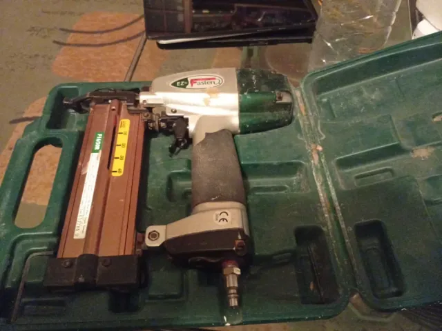 Clavadora neumática marca EZ-Fasten, modelo P1650R, en su maletín. - Incluye maletín de transporte. - Indicador de carga de clavos.