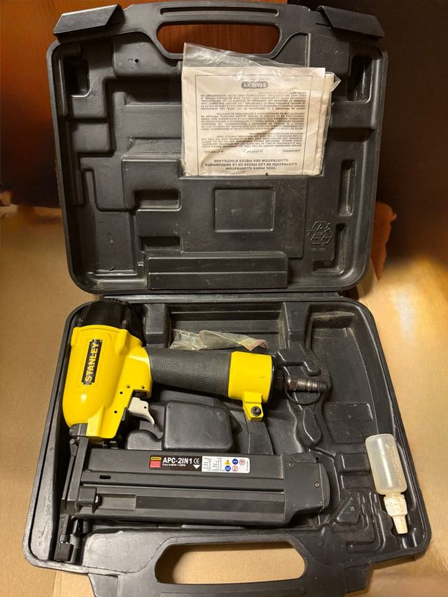 Detalles del productoClavadora neumática Stanley APC-2IN1 en perfecto estado. Incluye estuche de transporte y accesorios. - Funciona con clavos y grapas. - Diseño robusto y ligero. - Marca reconocida por su calidad. - Ideal para trabajos de bricolaje y profesionales.