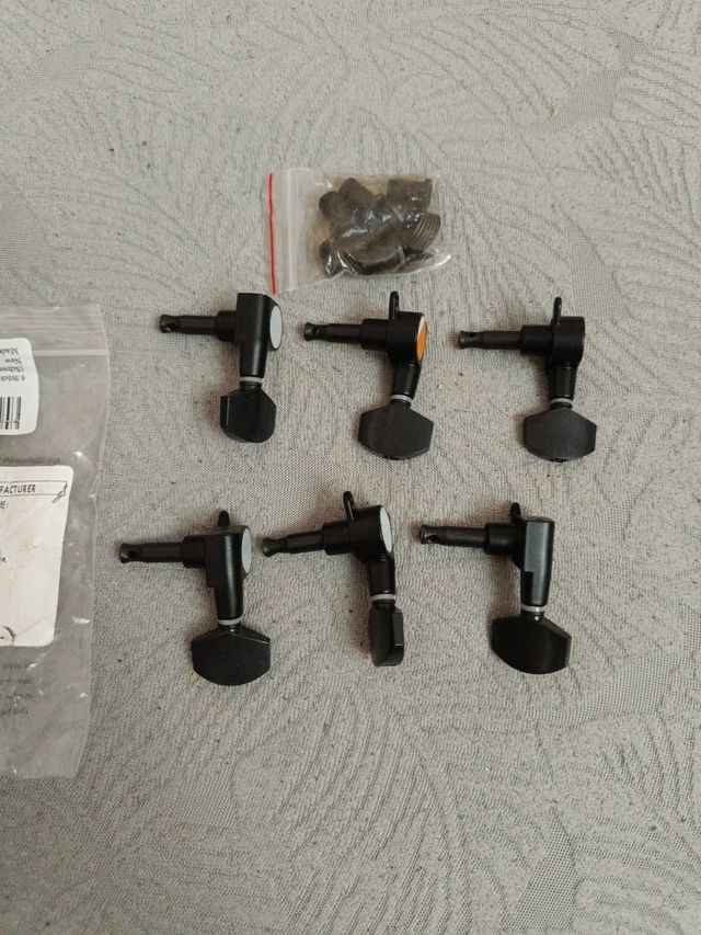 Detalles del productoClavijas para guitarra, color negro, sin estrenar. Se incluyen 6 clavijas con sus tornillos. Ideales para reemplazar las clavijas viejas o dañadas de tu guitarra. - 6 clavijas de afinación negras. - Incluye tornillos. - En perfecto estado.