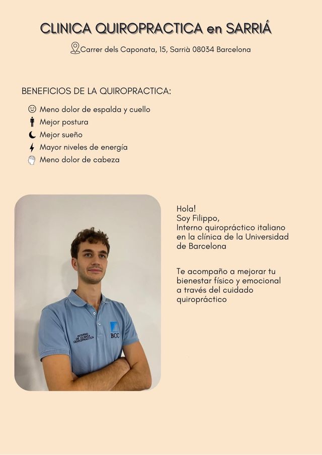 Detalles del productoHola, me llamo Filippo y soy un estudiante italiano de la Facultad de Quiropráctica. Soy al cuarto año y hace un año trabajo en la clínica, donde tratamos a pacientes externos bajo la supervisión de tutores y profesores, con el fin de garantizar la mejor asistencia. Tratamos problemas no solo de carácter fisico y neurológico, sino holísticos, incluyendo dietética, salud mental y cualquier factor que influya en nuestra salud y nuestros pensamientos. Los costes son muy reducidos, ya que se trata de una clínica universitaria: 35 € por la primera visita y 22 € por las visitas. no dudéis en escribirme si tienes curiosidades😃