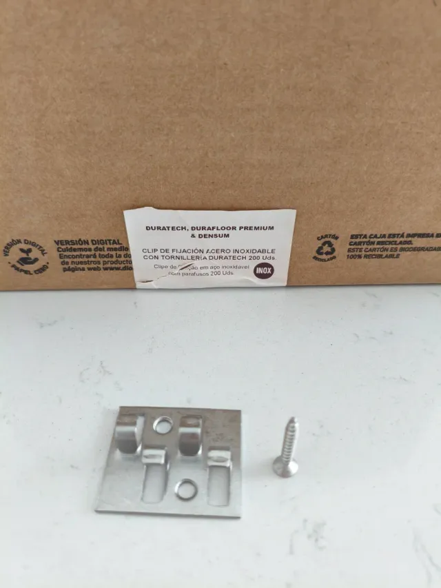 Detalles del productoClip de fijación de acero inoxidable para Duratech, Durafloor Premium y Densum. Incluye tornillería.