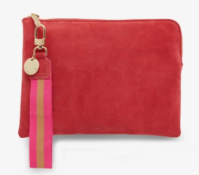 Super Exclusivo. Fabricado en ante Rojo y cremalleras y detalles en oro de 14 kilates. Nuevo con etiquetas. Medidas: Altot: 18.5cm Ancho: 24.5cm Profundo: 1cm