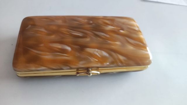 Clutch nacar,interior espejo con bolsillo interior, espacio para barra de labios y polvera.