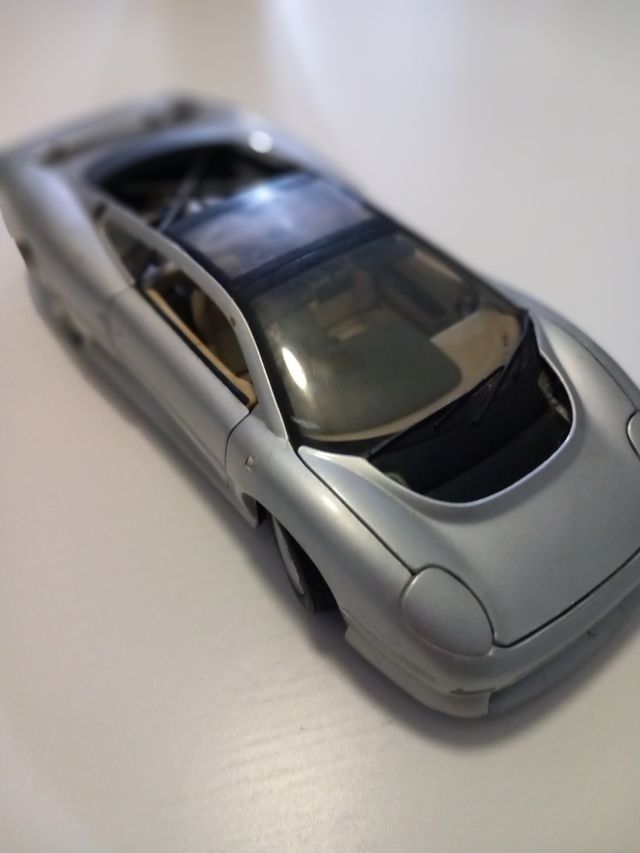 Réplica de coche a escala de la marca Maisto.marca JAGUAR XJ220,ESCALA 1/18 - Diseño deportivo plateado. - Detalles interiores visibles.