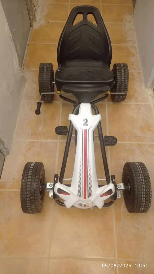 Detalles del productoCoche a pedales con asiento negro y detalles blancos y rojos.