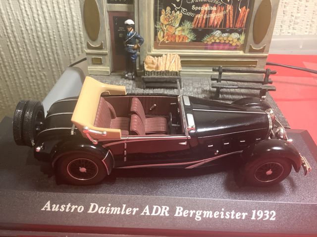 Detalles del productoRéplica a escala 1/43 del coche Austro Daimler ADR Bergmeister de 1932. Nuevo en urna. La urna especial por el tamaño, se encuentra dañada en un costado.