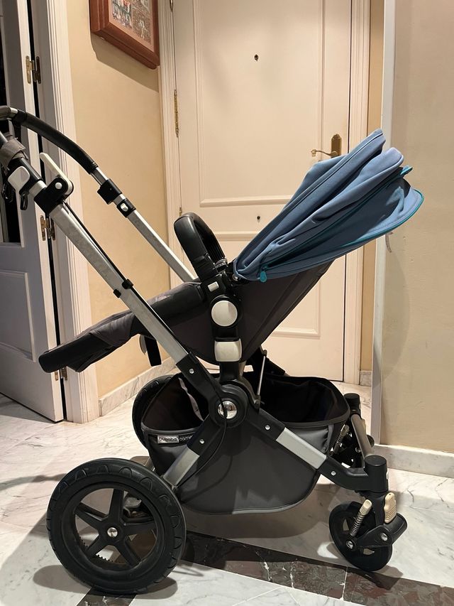 Cochecito Bugaboo Camaleón en buen estado con funda para lluvia. - Chasis de aluminio. - Capazo y silla. - Capota azul. - Ruedas todoterreno.