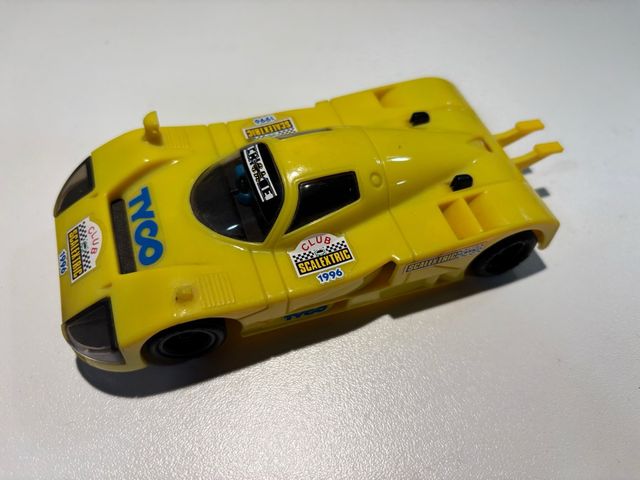 Coche de juguete amarillo del Club Scalextric de 1996. Falta alerón y un espejo retrovisor, por lo demás funciona correctamente.