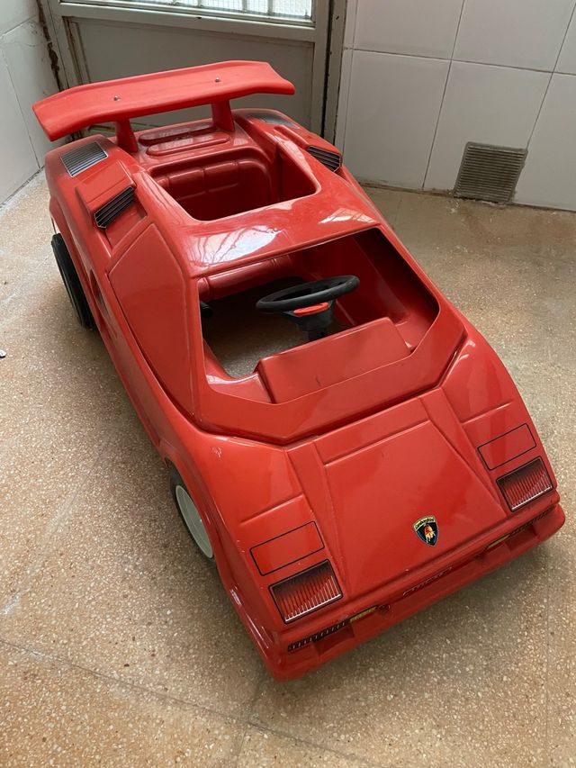 Divertido coche de juguete con diseño inspirado en Lamborghini. - Color rojo brillante. - Volante para dirigir. - Ala trasera deportiva.