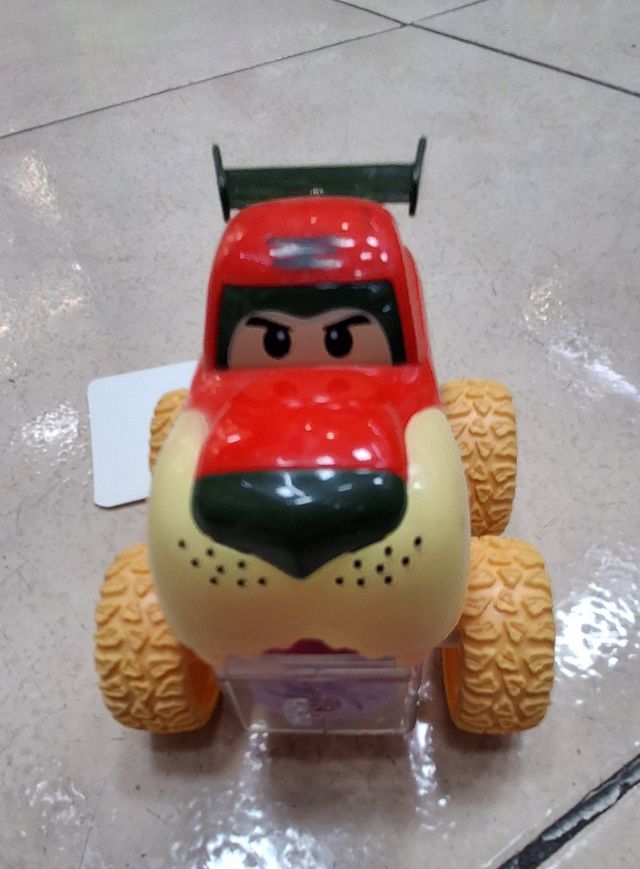 Coche de juguete de estilo monster truck con diseño de perro. - Color rojo y amarillo. - Ruedas grandes todoterreno. - Ala trasera deportiva.