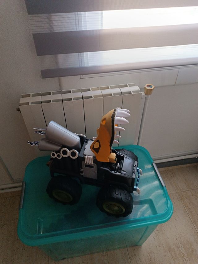 Coche monstruo con cabeza de dinosaurio, en buen estado. - Incluye un pequeño muñeco. - Diseño de camión todoterreno. - Cabeza de dinosaurio articulada.