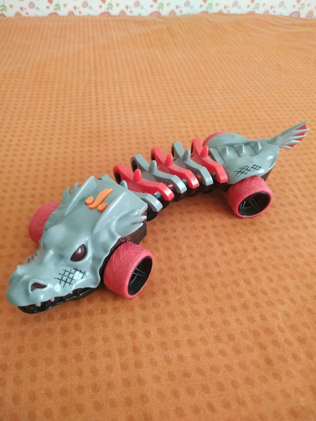 Coche con forma de reptil . Hot wheels. Funciona a pilas . Se le encienden luces en ojos. Hace ruidos y se mueve.