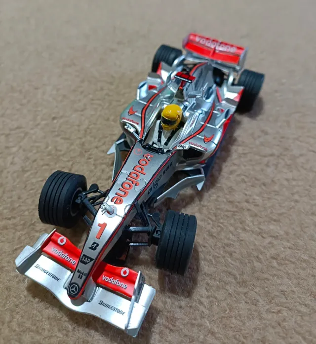 Réplica de coche de Fórmula 1 McLaren Vodafone. - Diseño detallado con patrocinadores. - Incluye figura de piloto.