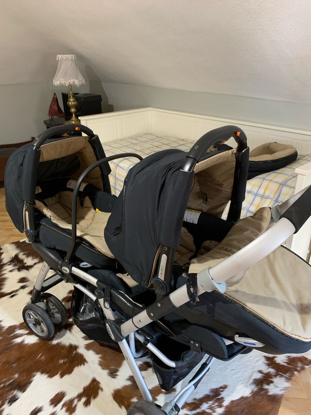 Vendo coche gemelar Jane en buenas condiciones. Es ligero y fácil de maniobrar. - Dos asientos reclinables. - Capota para cada asiento. - Amplia cesta portaobjetos.