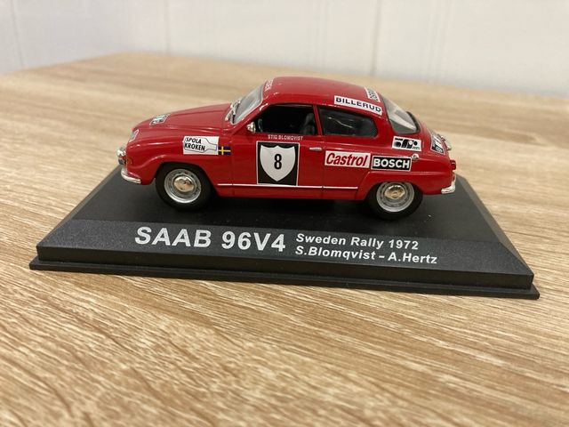 Detalles del productoRéplica detallada del coche SAAB 96V4 que compitió en el Rally de Suecia de 1972.