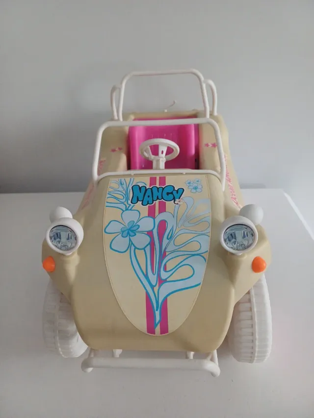 Coche de Nancy para vivir grandes aventuras. - Diseño en color beige con detalles florales. - Incluye volante rosa. - Ruedas blancas.