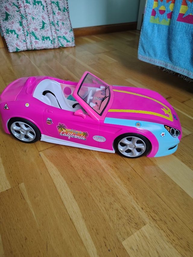 Detalles del productoCoche descapotable rosa para muñeca Nancy, con detalles de California y rayas azules y amarillas.