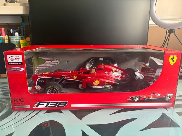 Detalles del productoRéplica del coche de Fórmula 1 Ferrari F138 de Rastar a escala 1/12. Ideal para coleccionistas y aficionados a las carreras.