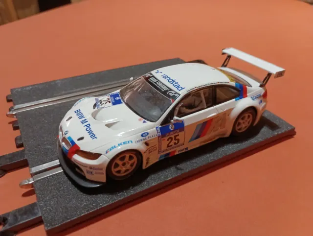 Coche de slot BMW M3 GT2 ALMS. - Modelo de competición. - Decoración detallada con patrocinadores.