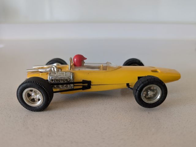 Coche de Scalextric, específicamente un modelo BRM F1 amarillo de Exin, de la 1ª serie C37.