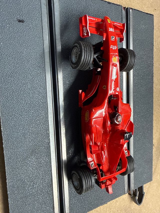 Detalles del productoCoche de Scalextric con la forma de un Ferrari de Fórmula 1. Es un modelo analógico.