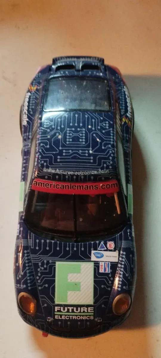 Detalles del productoCoche de Scalextric con un diseño inspirado en circuitos electrónicos y el patrocinio de Future Electronics.