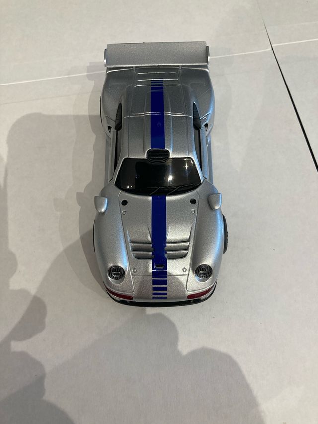 Réplica del Porsche 911 GT1 de Scalextric Ninco en color plata con detalles en azul. - Diseño deportivo. - Líneas de competición.