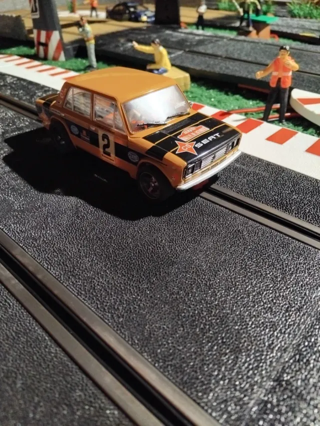 Coche de Scalextric SEAT en color naranja, con detalles de rally y dorsal número 2. - Diseño deportivo. - Decoración de rally. - Escala para circuitos.
