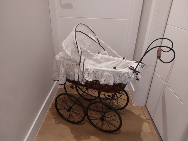 cochecito de muñeca. Largo del capazo 64,5cms. Ancho del capazo 30cms. Altura desde el suelo al capazo. 55cms. Altura desde el suelo al manillar 70cms. Muy bonito y elegante.