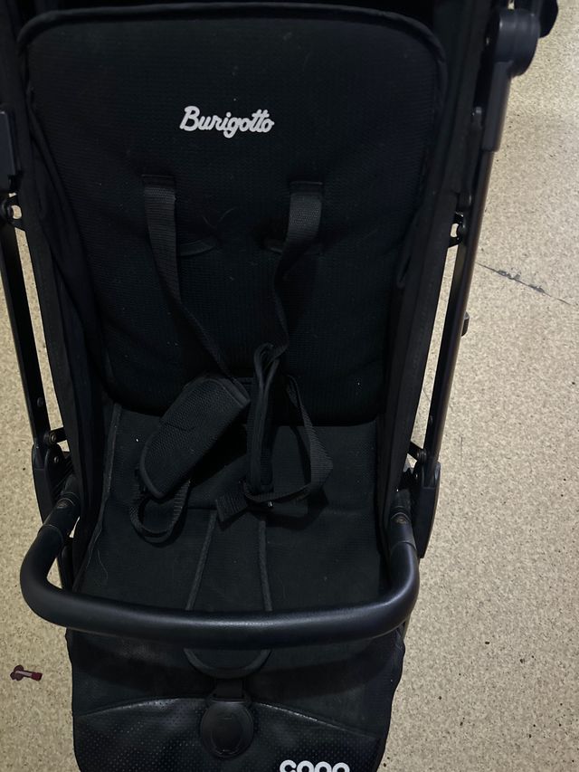 Cochecito de bebé marca Burigotto en color negro. Ideal para paseos cómodos. - Diseño moderno y funcional. - Asiento acolchado. - Barra de seguridad. - Arnés de sujeción.
