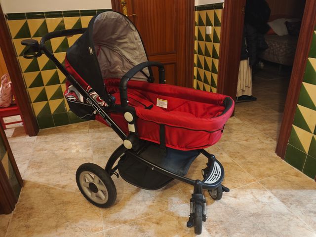 Cochecito de bebé en buen estado, ideal para paseos. - Color rojo y negro. - Capazo amplio y cómodo. - Ruedas todoterreno. - Plegable para fácil transporte.