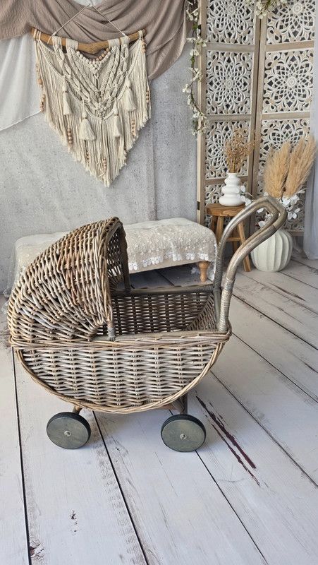 Detalles del productoCochecito de mimbre, perfecto para sesiones de fotos de bebés. Su diseño clásico y material natural aportan un toque vintage.