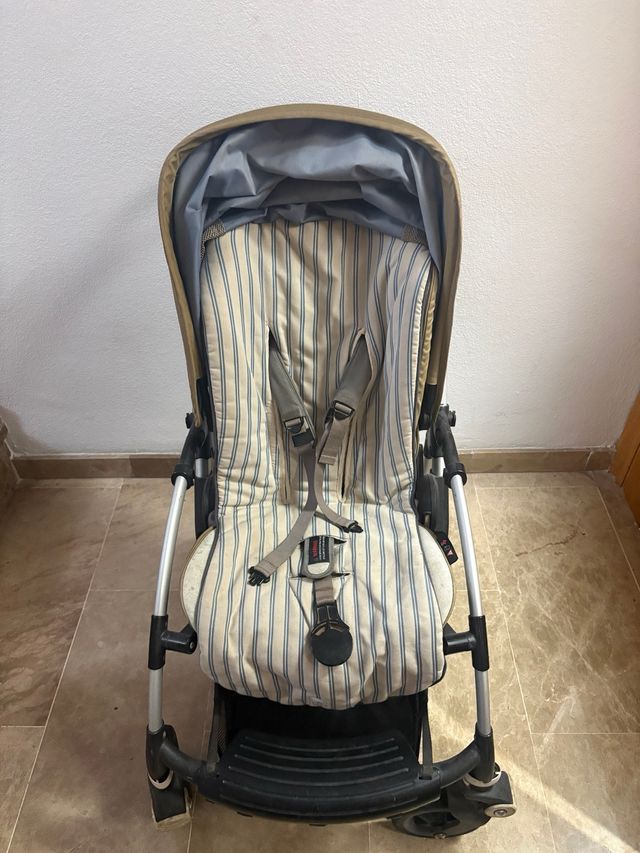 Detalles del productoCochecito de paseo bebé-niño. Marca Bugaboo Bee. Color beige con capota beige encerada e interior azul. Incluye funda de la sillita a rayas hecha a medida. Todo lavable en lavadora: funda del cochecito y funda hecha a medida.