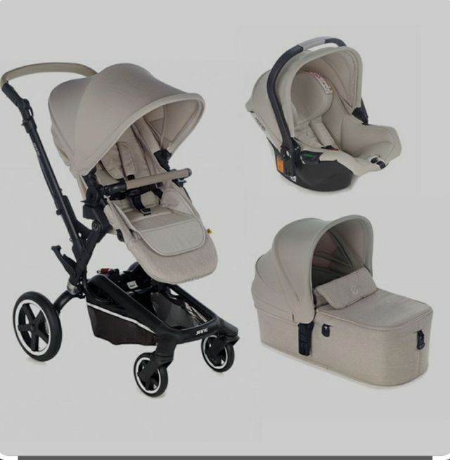 Detalles del productoConjunto de capazo, silla y portabebe, en color beige.