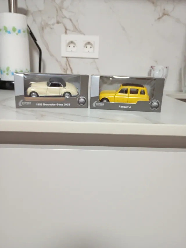 Dos coches de colección en sus cajas originales. - Coche 1: 1955 Mercedes-Benz 300SL - Coche 2: Renault 4
