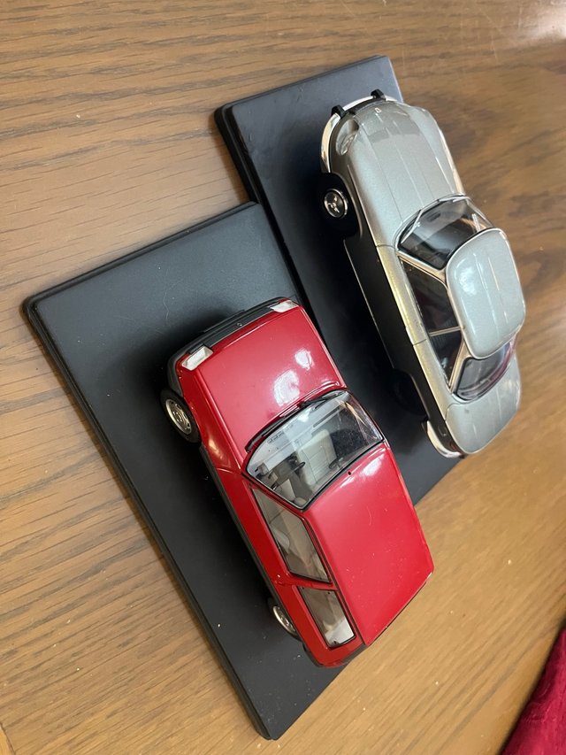 Dos coches de colección en miniatura, uno rojo y otro plateado, presentados sobre bases negras. - Coche rojo. - Coche plateado.