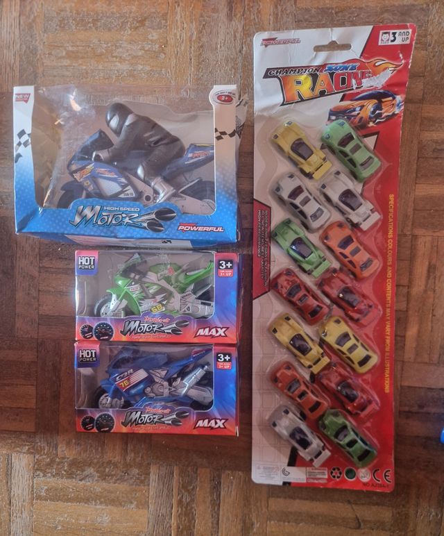 Detalles del productoSet de juguetes para niños que incluye 3 motos y un pack de 8 coches de carreras.
