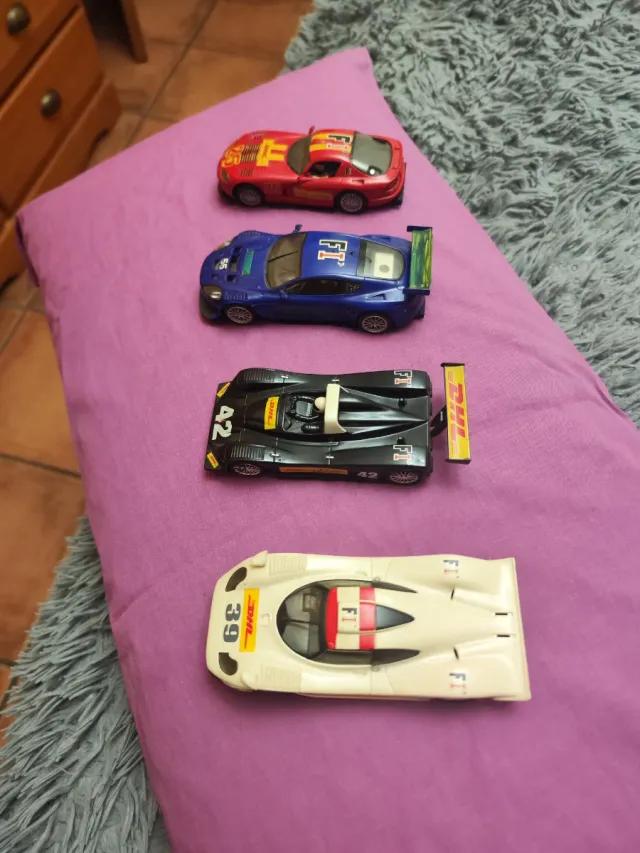 Lote de 4 coches de Scalextric. Lola B98/10- Aston martín DBR9-ViperGts R -Porsche 911Gti 98 - Coche rojo. - Coche azul. - Coche negro. - Coche blanco.
