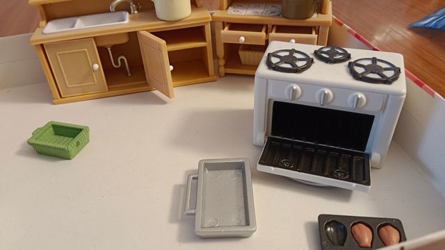 Detalles del productoDos sets de Sylvanian Families. La conejita con la nevera trae helados, botella de agua, bandeja de hielos y verduras. La cocina con mesa y sillas trae platos, jarras, horno, todo con puertas y cajones que funcionan de verdad.