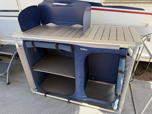 Cocina de camping plegable de la marca Bruner. Ideal para llevar en tus salidas. - Estructura de aluminio. - Tejido azul. - Múltiples compartimentos de almacenamiento.