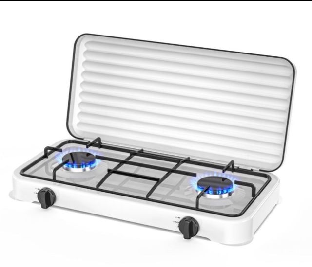 Detalles del productoCocina de gas portátil con dos quemadores. Ideal para camping o espacios pequeños.
