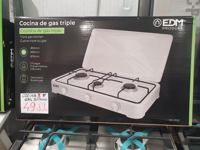 Detalles del productoCocina de gas portátil de la marca EDM con tres quemadores. Ideal para camping o uso doméstico.