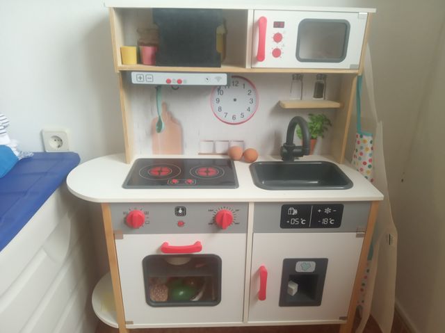 Divertida cocina de juguete de madera, ideal para regalar. - Incluye horno, fogones y fregadero. - Estructura de madera resistente. - Diseño colorido y atractivo.