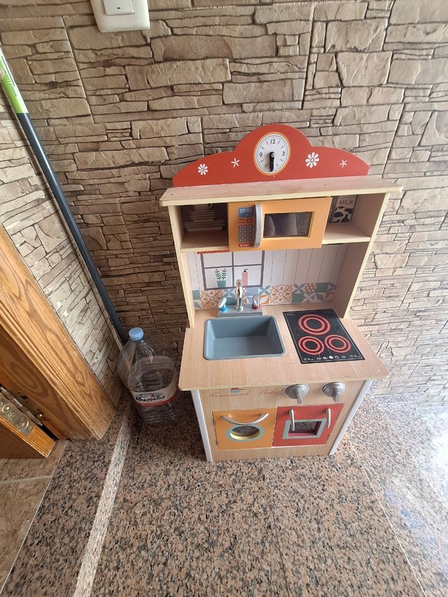 Divertida cocina de madera para niños, con un diseño colorido y atractivo. - Incluye horno, microondas y fogones. - Pila y grifo. - Reloj decorativo.